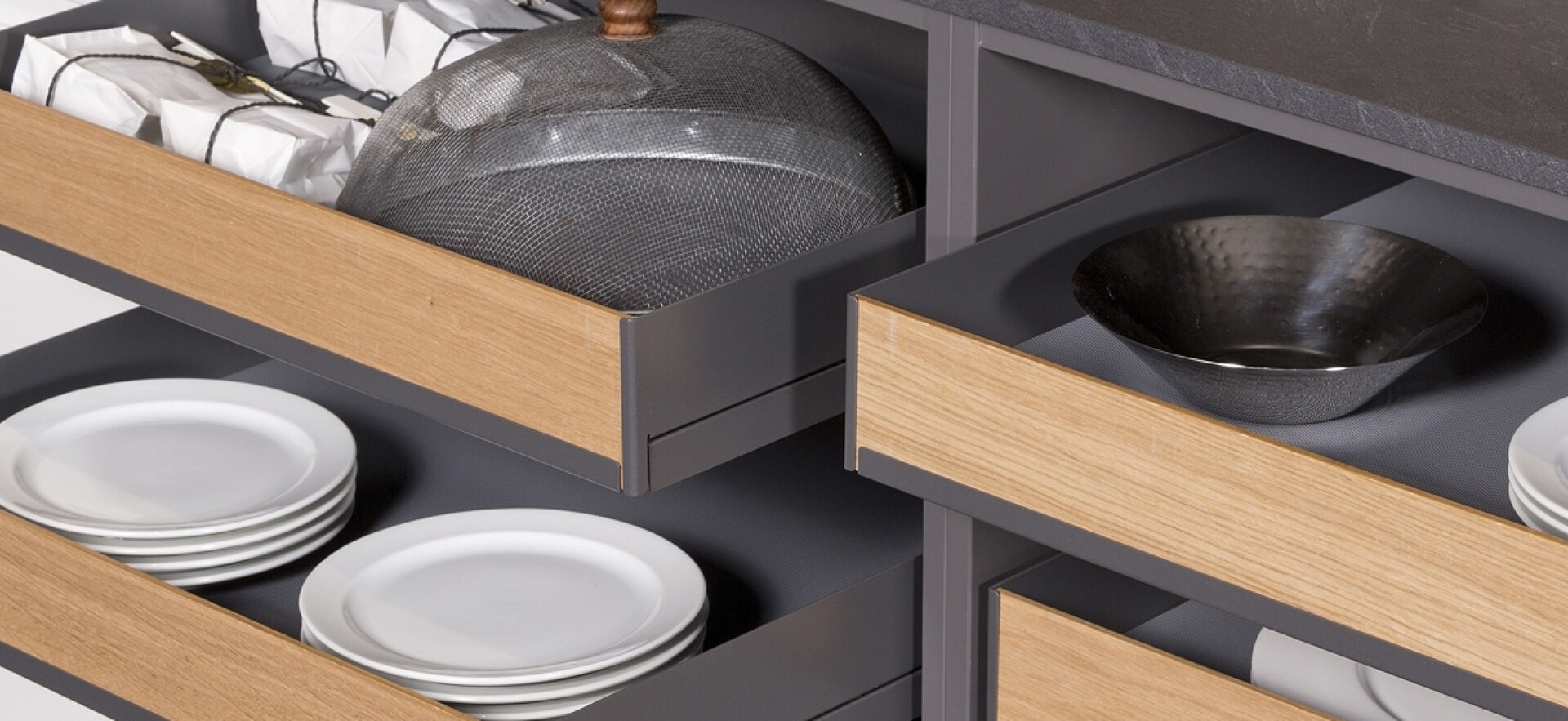 Eine besondere Lösung zeigt das Bild: eine Art Kreuzung aus Schubladenunterschrank und Regal. Auf den Auszügen lässt sich einiges stapeln. Dabei sind Front, Seitenteile und Rückwand der Auszüge aber nur halb so hoch wie die verfügbare Höhe. So haben Sie wunderbar Einblick und im Nu Zugriff auf alles, was Sie hier verstauen.