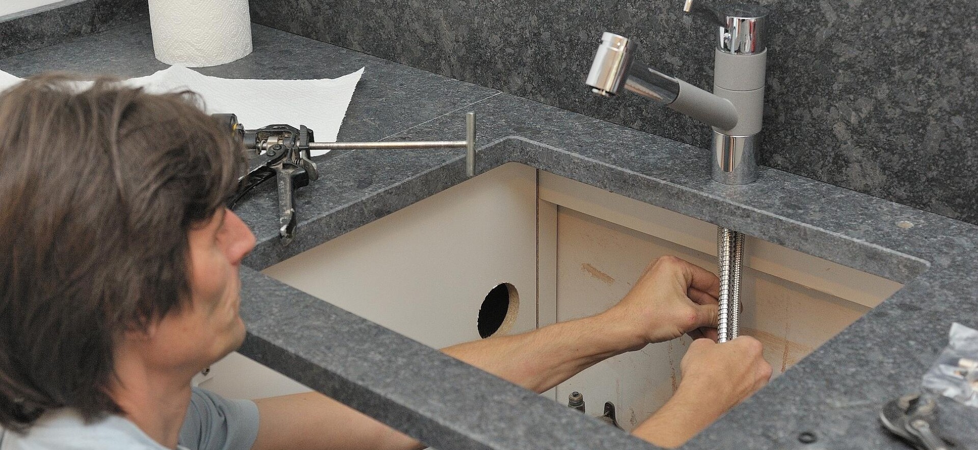 Zeit für eine Verbesserung Ihrer Küchenspüle? – Nein, wir meinen nicht in erster Linie das Spülbecken, eher das, was darunter ist. Denn für den Spülenschrank bieten wir Ihnen unterschiedliche Lösungen, um gefiltertes Wasser direkt aus dem Hahn darüber fließen zu lassen: Sie bekommen von uns Systeme, die Umkehrosmose können und das Wasser zugleich ionisieren und remineralisieren. Dazu montieren wir Ihnen die passende 4-Wege-Armatur mit Schlauchbrause und einstellbaren Wasserstrahloptionen. Gerne informieren wir Sie zu den Möglichkeiten, die natürlich auch heißes, sprudelndes und dosiertes Wasser beinhalten können.